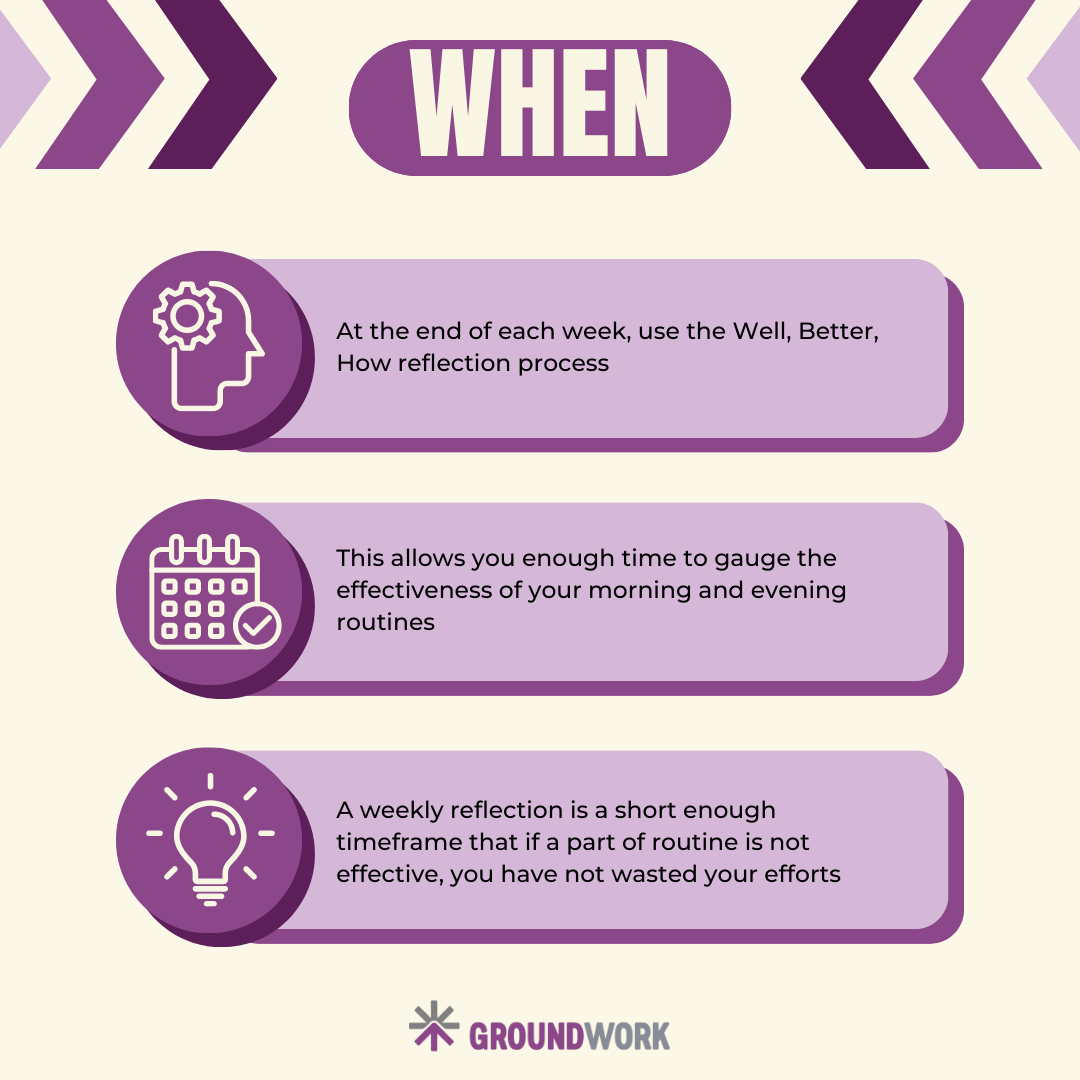 Timing your reflection is just as important as doing it. Use the Well, Better, How method at the end of each week to sharpen your habits.